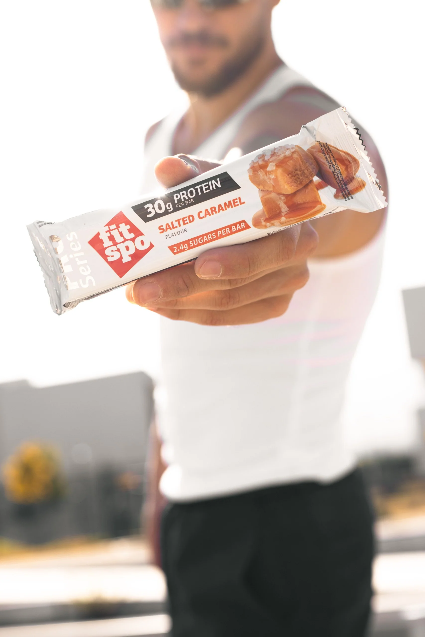 FitSpo Pro „Salted Caramel“ – sūrios karamelės skonio baltyminis batonėlis, sukurtas aktyviems žmonėms. Viename batonėlyje – 30.7g aukštos kokybės baltymų ir jokio pridėtinio cukraus, todėl tai puikus pasirinkimas po treniruotės ar kaip sveikesnis užkandis dienos metu. Puikiai suderintas karamelės saldumas ir lengvas sūrumas, todėl skonis tampa intensyvus ir itin malonus.. Tinka sportuojantiems, siekiantiems palaikyti raumenų masę bei ieškantiems baltymingos alternatyvos įprastiems saldumynams.