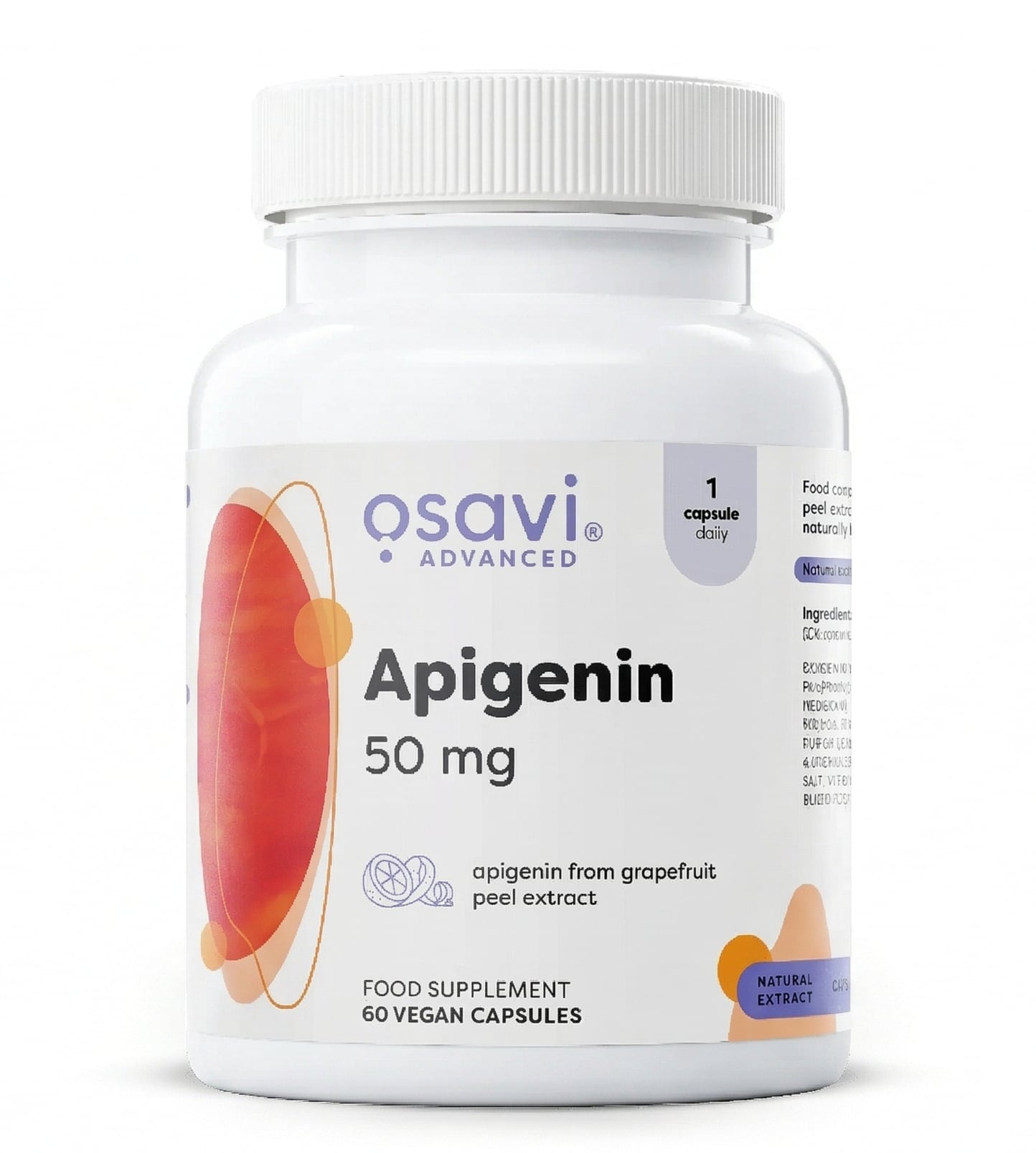 Apigeninas yra natūralus augalinis junginys, priklausantis flavonoidų grupei. Nors jo randama ramunėlėse ar petražolėse, gauti veiksmingą dozę tik su maistu yra sudėtinga. Osavi Apigenin naudoja itin stiprų greipfrutų žievelių ekstraktą (santykis 45:1), kuris leidžia vienoje kapsulėje pateikti 50 mg šios vertingos medžiagos – tai prilygsta dideliam kiekiui šviežių augalų.