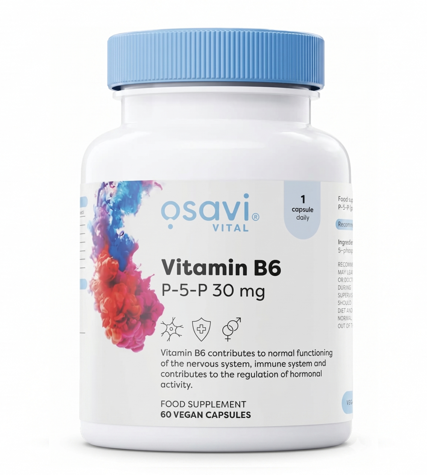 „Osavi Vitamin B6 P-5-P“ suteikia 30 mg aktyviosios vitamino B6 formos (piridoksal-5-fosfato). Skirtingai nuo įprasto piridoksino, P-5-P yra „paruošta naudoti“ forma, kurią organizmas įsisavina nedelsiant. Tai esminis vitaminas, padedantis mažinti pavargimo jausmą, palaikantis normalią psichologinę funkciją bei reguliuojantis hormonų aktyvumą.